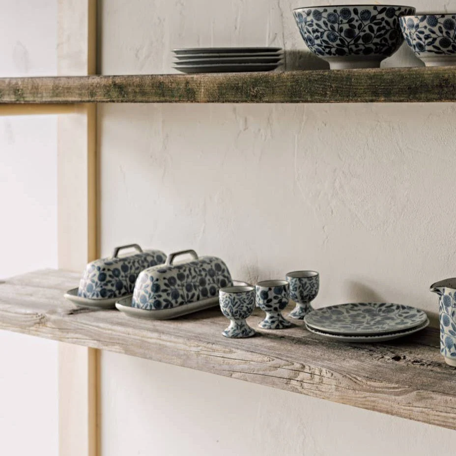 Lidded stoneware dish with earthy blue floral pattern keeps butter clean and cool and looks great doing it.