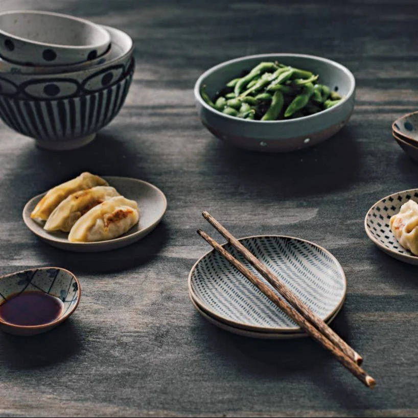 This simple spoon rest is made of stoneware with a lightly speckled matte glaze and geometric blue detailing.